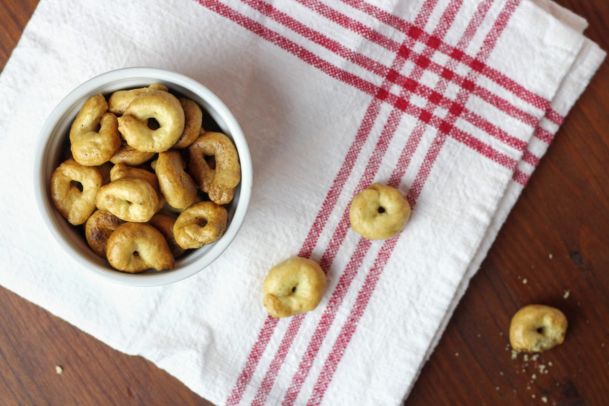 Making taralli is quite simple: you prepare a dough of flour, olive oil, salt, and wine, adding in whatever flavorings you prefer. After that, the dough is shaped into little rings, made by wrapping a rope of dough around your finger(s) and pressing the two ends together to close the loop. Then you boil them for a few minutes, followed by baking until they’re golden brown and crunchy.