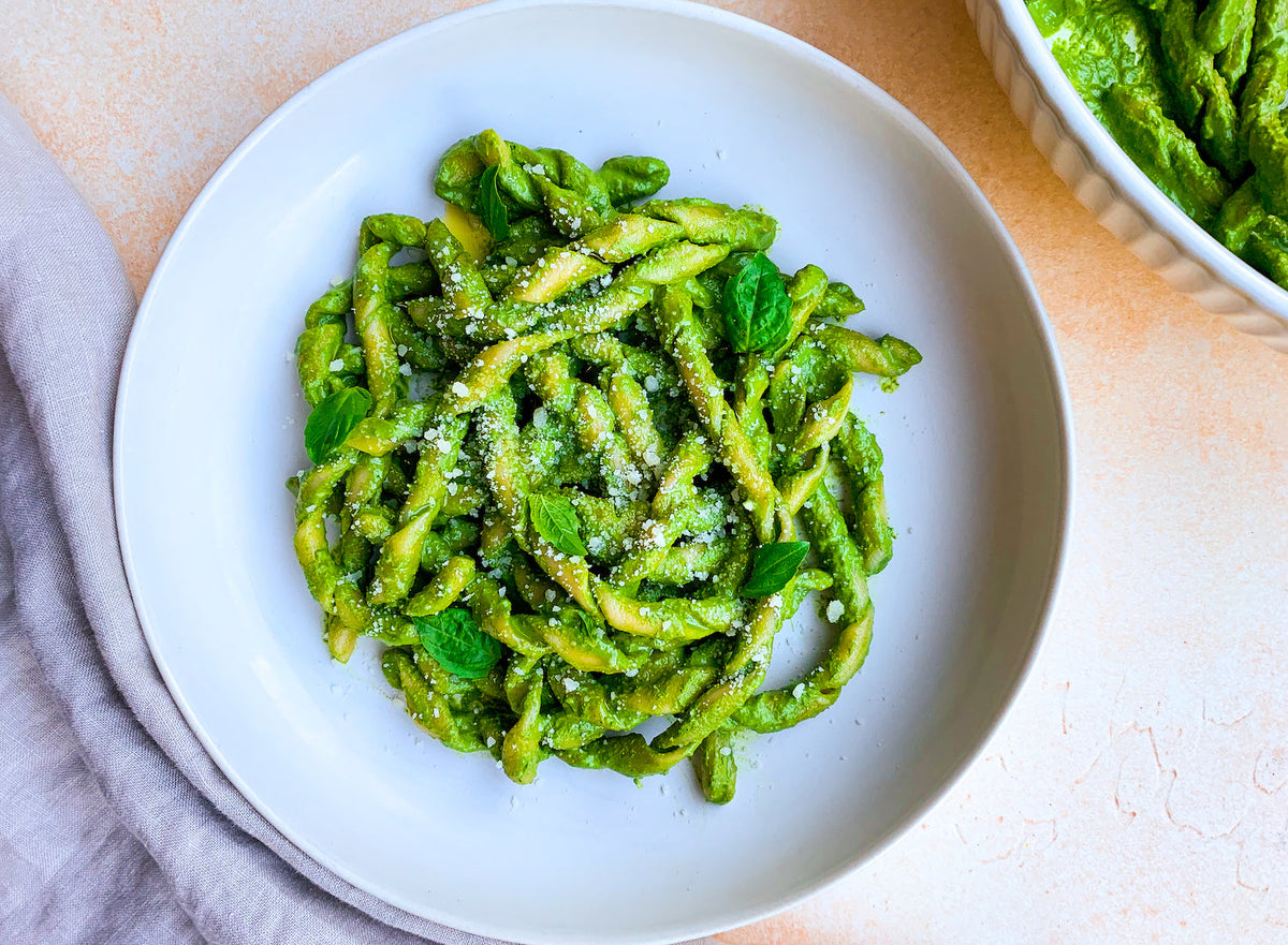 You’ll often find busiate served with pesto alla trapanese, a tomato- and almond-based condiment perfect for summer. I’ve switched things up by pairing some common pesto ingredients with leftover radish tops for a peppery punch—but don’t hesitate to use whatever greens and nuts you have on hand. It’s finished with a touch of ricotta and Greek yogurt, an addition inspired by Rosetta’s basil sauce in the Pasta Grannies cookbook, for a little added lusciousness.
