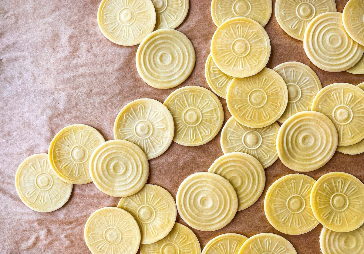 While they seem intricate, they are one of the simpler shapes to make. You don’t need any special hand techniques –all you do is roll the dough out flat and cut out the coins with a special stamp. If you have a hand-cranked pasta machine that’s helpful in getting the dough thin enough, but you could also do this by hand with a rolling pin.