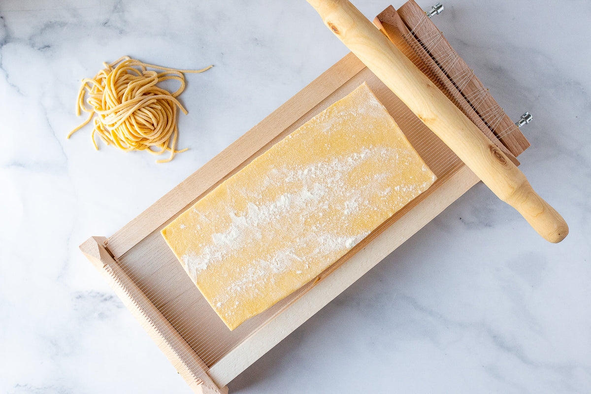 Whether you’re sheeting your pasta dough through a hand-cranked pasta machine or rolling it out by hand, be sure not to roll it too thin. You want your sheet of dough to be the same thickness as the spaghetti alla chitarra are wide. This is because spaghetti alla chitarra should be “square” and have a bit of a bite to them.