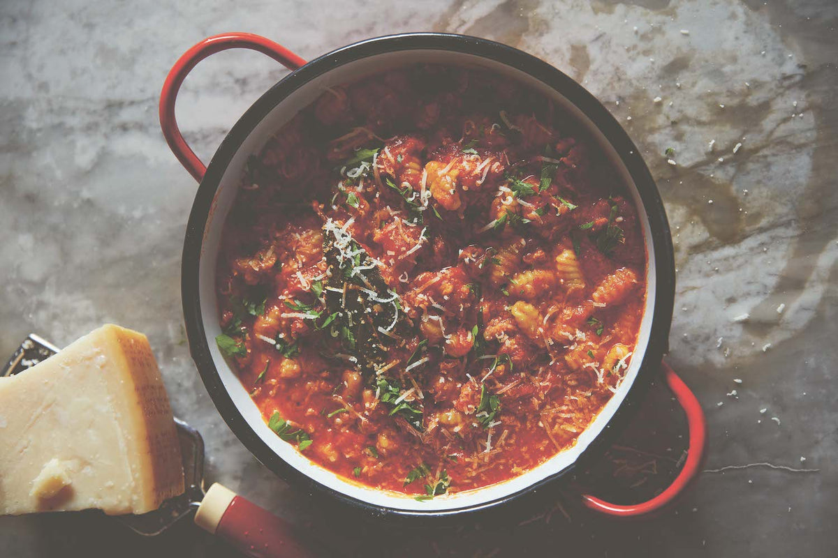 Bring another pan of water to the boil and salt well. Tip in your malloreddus and cook for 1–2 minutes, until they bob to the surface. Ladle out and place in the hot sauce with a small ladle of pasta cooking water. Add the grated pecorino and stir gently, turning all of the nuggets over in their sauce. Continue to cook for another minute or so until the sauce turns silky.