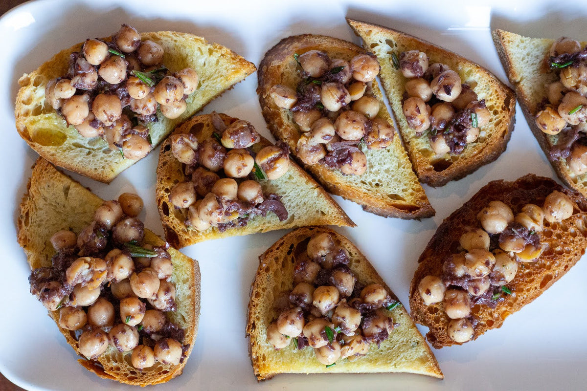 Here we’re serving up olive-marinated chickpeas on top of warm, toasty slices of bread for a satisfying appetizer.
