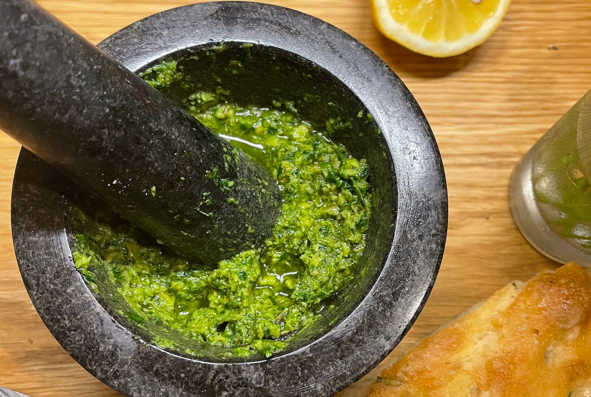 In the bowl of a mortar and pestle, add garlic and salt and grind to a paste. Add some of the olive oil and all of the fresh herbs. Continue to grind until herbs have broken down and are well incorporated, but not completely puréed.