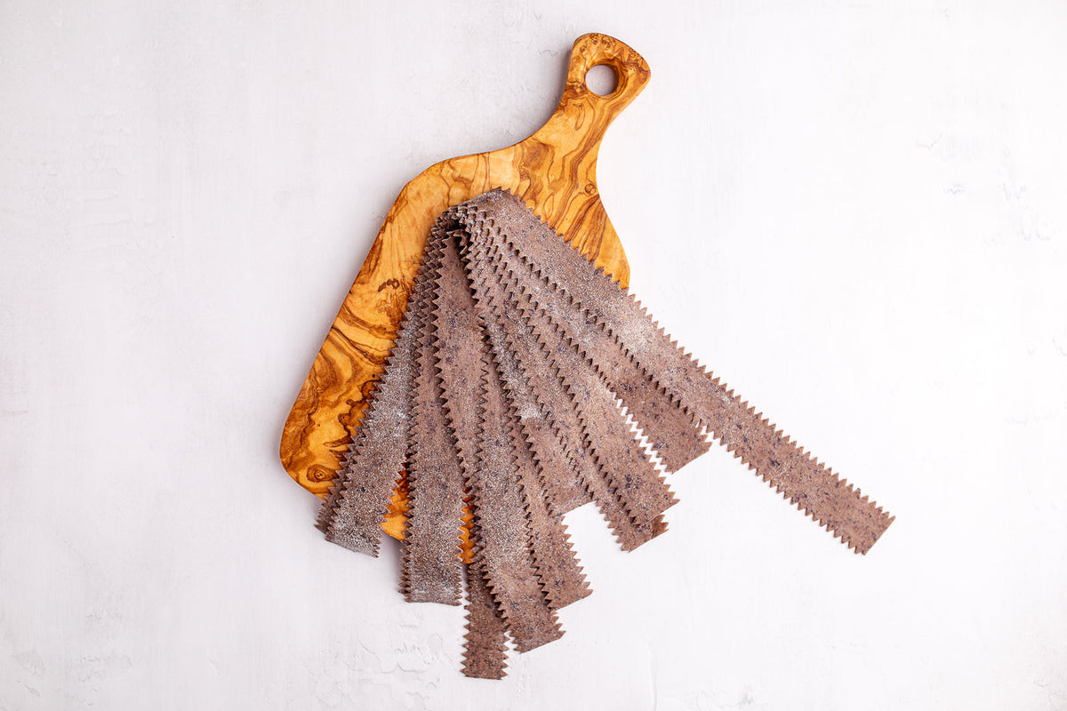 I’ll spare you the tragic story of Princess Mafalda and instead get right to this recipe: homemade olive mafaldine. Typically mafaldine are made from durum wheat semolina and water, and extruded through a bronze die, but here I’m breaking tradition and making them fresh, colored a blackish-purple with olive puree.
