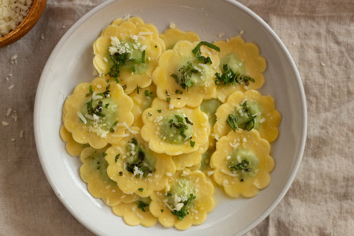 Using a ravioli stamp , cut out flower shapes. Pipe about a teaspoon of the filling in the center of half of the flowers. Use the remaining circles to top each piece. Gently seal the ravioli with your fingertips, removing any air bubbles as best you can. Set aside each finished raviolo on the floured baking sheet.
