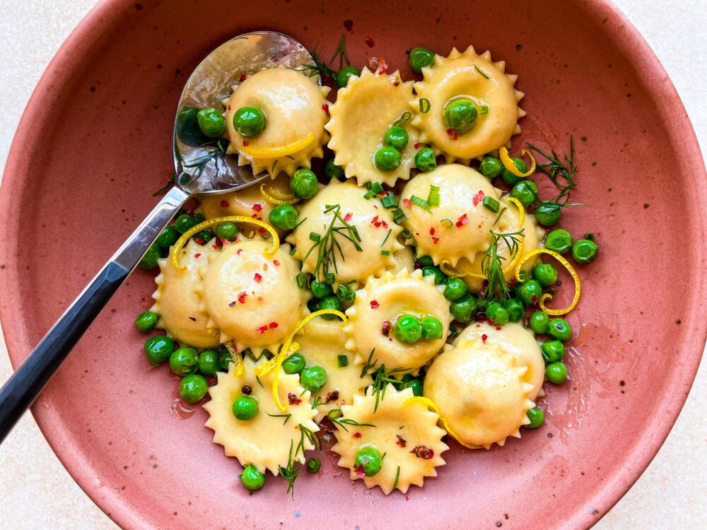 6. Divide the anolini among bowls. Spoon over the butter sauce and peas, and finish with minced chives, dill, and a sprinkling of crushed pink peppercorns (or lots of freshly ground black pepper). Enjoy immediately, with the remaining lemon wedges for squeezing.