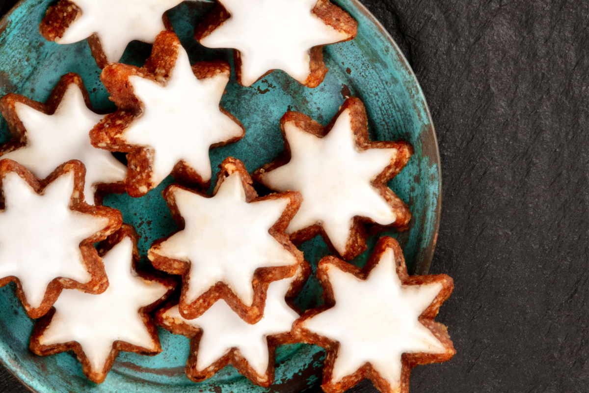 Zimsterne are spiced star-shaped cookies typically prepared during the holidays in Germany, Austria, and Italy’s Alto-Adige region. Finely ground almond meal is combined with whipped egg whites, sugar, and spices. The dough is cut into festive stars and each cookie is decorated with an egg white icing and baked just until the icing has hardened on top.