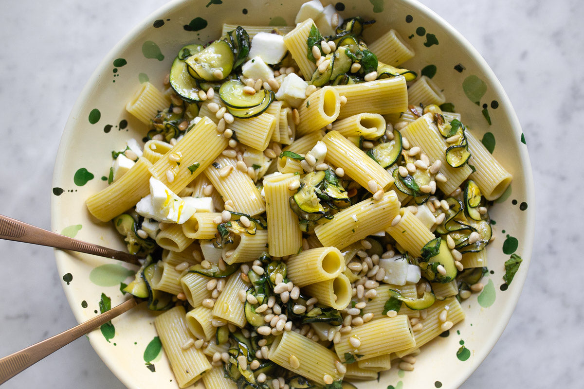 For my zucchini pasta salad, I wanted to ensure there was plenty of marinade, so I doubled that portion of the recipe. I used some of the marinade for the zucchini and reserved the remainder to toss with the pasta towards the end. I also added fresh mozzarella—because, in my opinion, pasta salad isn’t complete without cheese—and topped it with toasted pine nuts for added crunch and nuttiness.