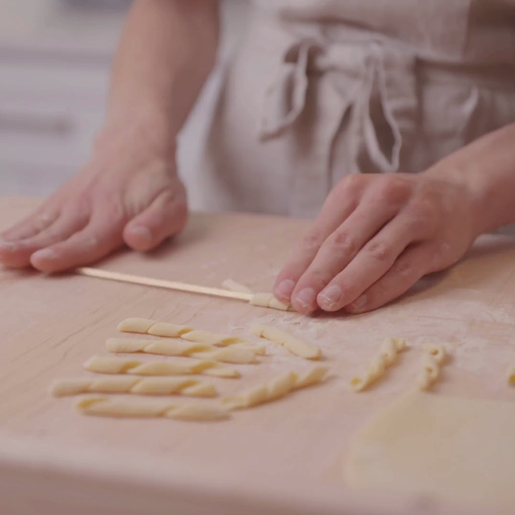 Taken from the word ferro, or iron, this brass utensil is used for making long, tubular pasta shapes like busiate, bucatini, maccheroni, and even homemade fusilli. In the past, inventive cooks used reeds or sticks to make their shapes, though today’s home cooks rely more on wire or metal tools like these. Typically used for durum wheat pasta shapes, roll your dough around the ferretto for a delightfully corkscrew-style result (perfect for catching sauce, of course).