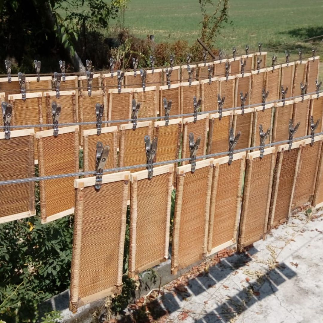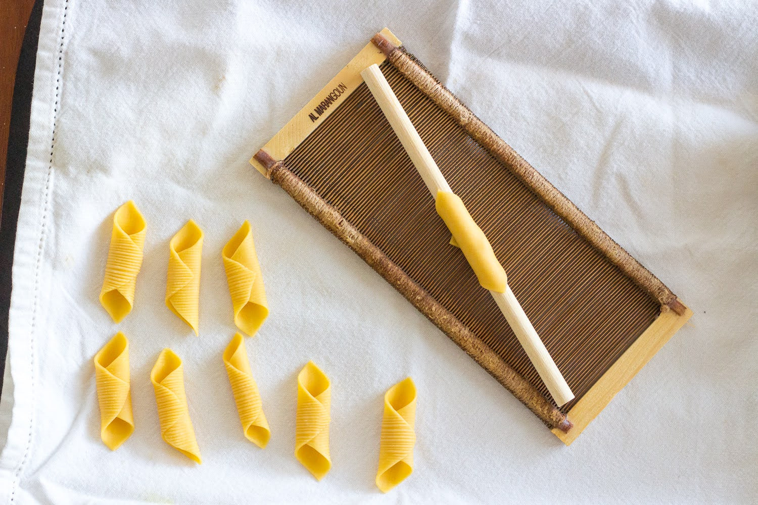 Legend has it that the first garganelli, a ridged tube pasta, were created when a housewife improvised and rolled her pasta dough over a nearby weaving loom. Her ingenious pasta invention eventually led to the use of a pettine per la pasta, or “pasta comb.” Each one is made by hand from tiny wooden slats that are secured together between two wooden rods using twine. Each pettine comes with three rods of different diameters, suitable for rolling garganelli or the tube-shaped maccheroni al pettine, both big and small.